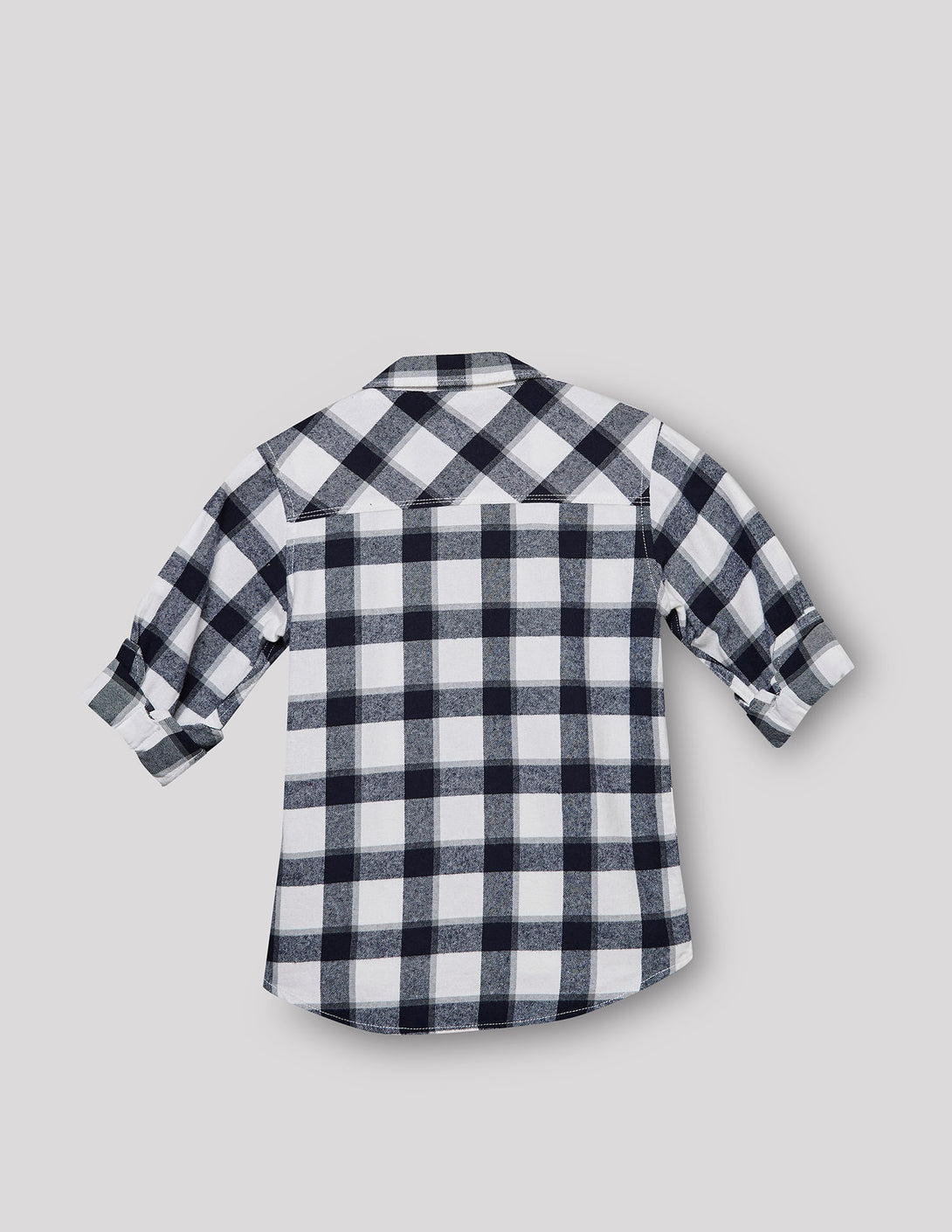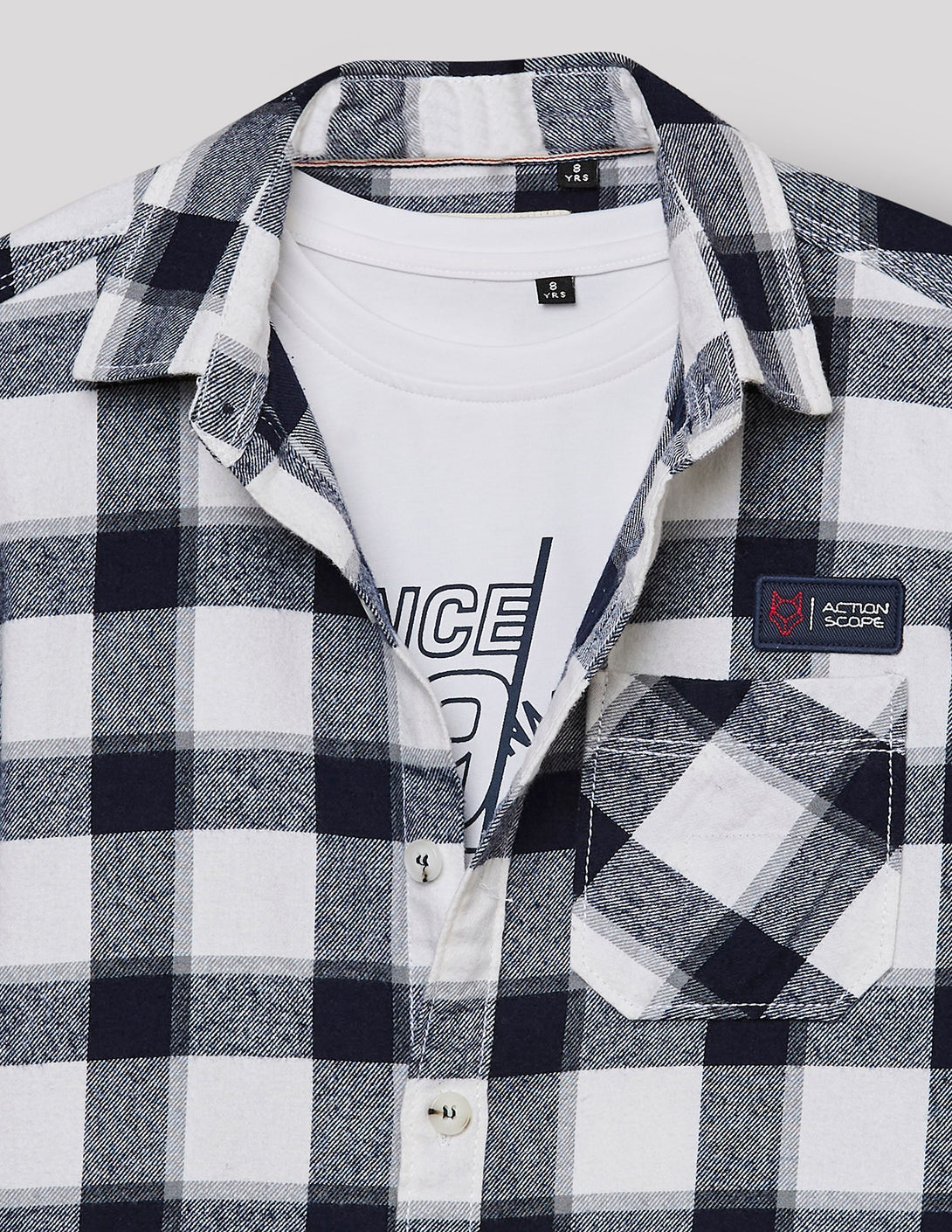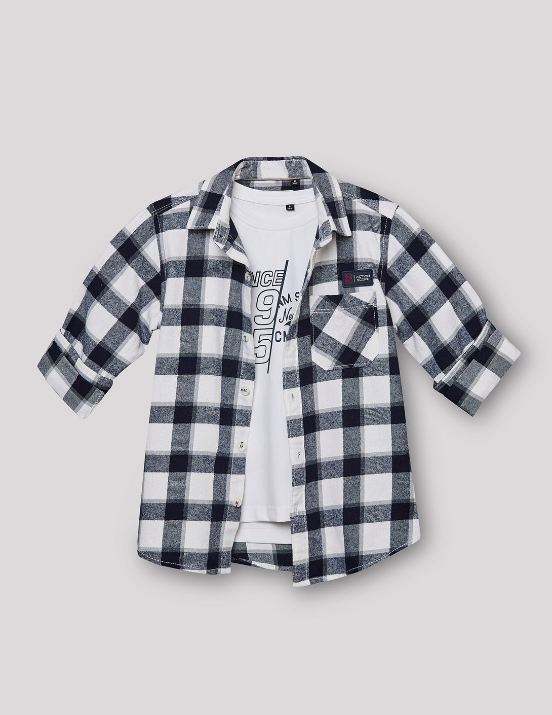 This set includes a navy and white checked button-down shirt paired with a printed white T-shirt. Made from soft cotton fabric for comfort and easy layering. Ideal for casual outings.