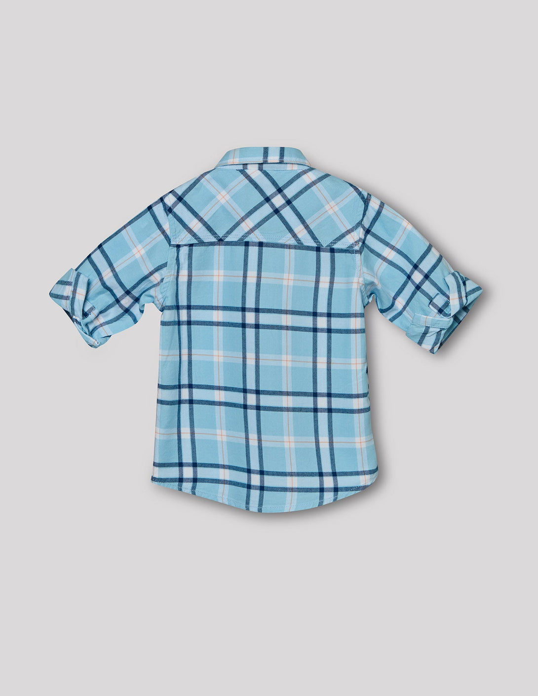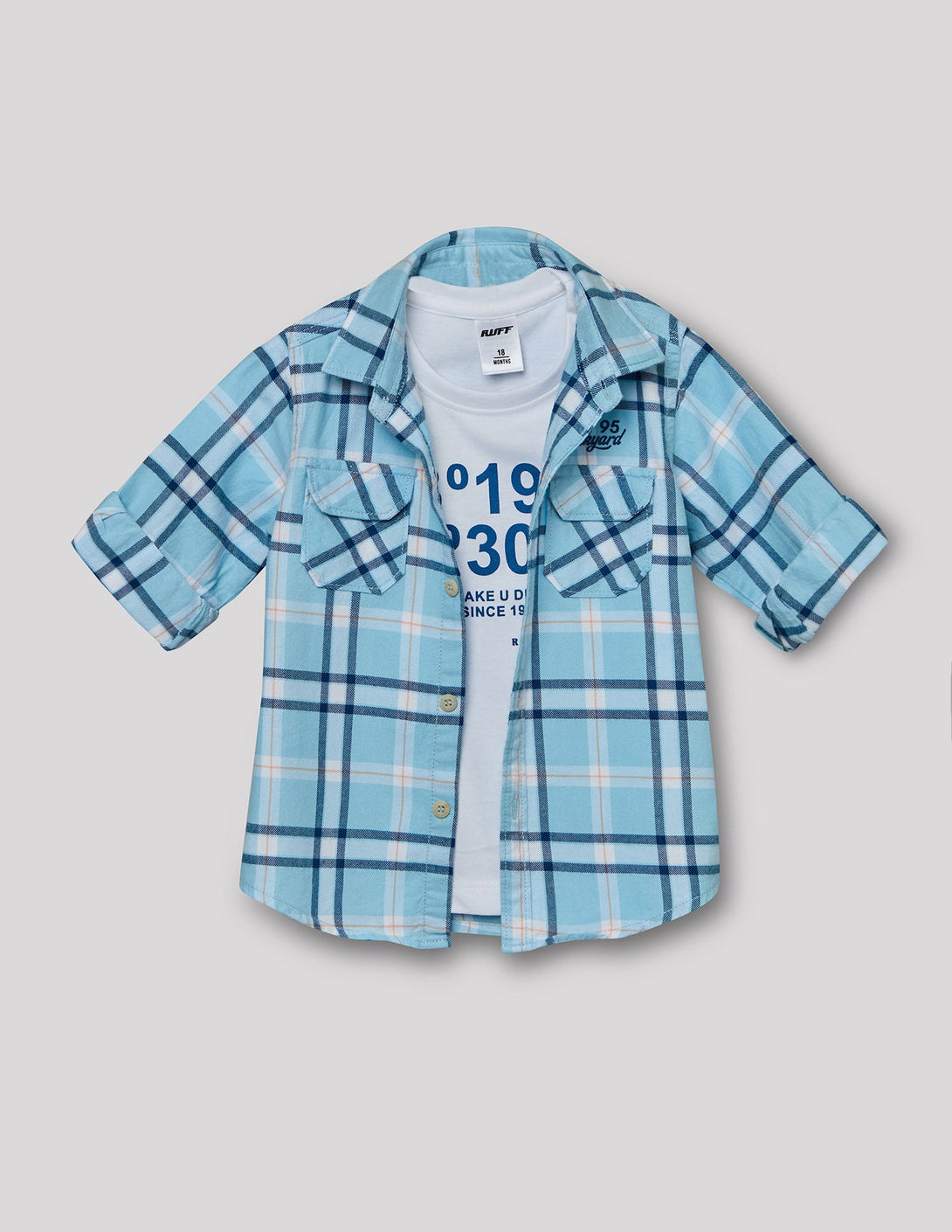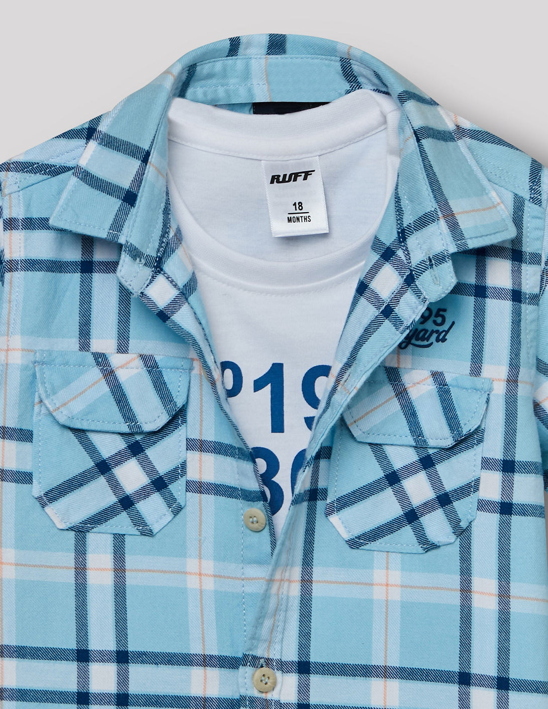 Get a cool, layered look with this 2-piece set. It includes a light blue plaid shirt with chest pockets and a white inner t-shirt with a bold graphic print. It's the perfect effortless outfit for any casual day.