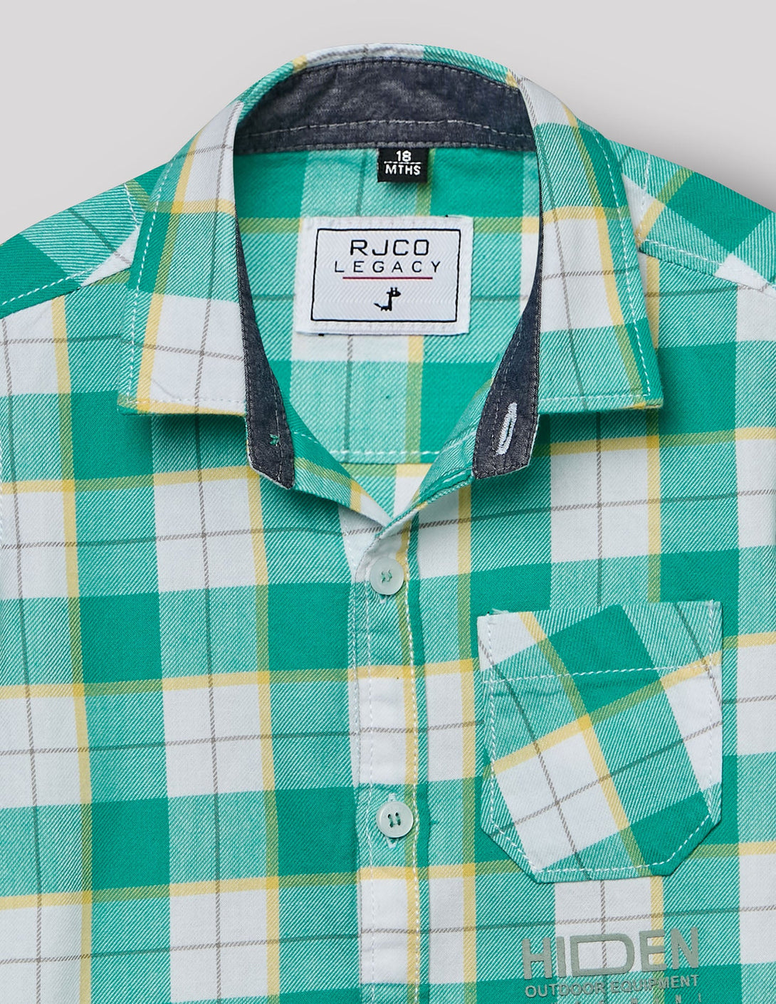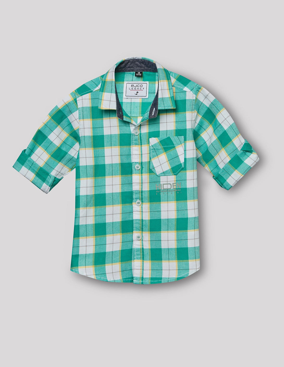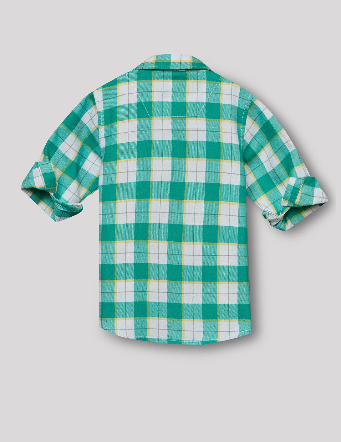 This bright and cheerful shirt is a perfect pick for any occasion. It features a classic green, white, and yellow check pattern, a single chest pocket, and roll-up sleeves for a cool, casual style.