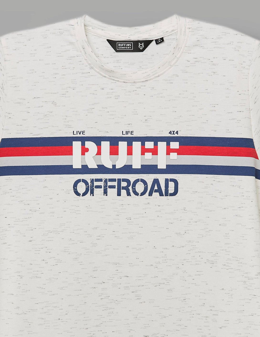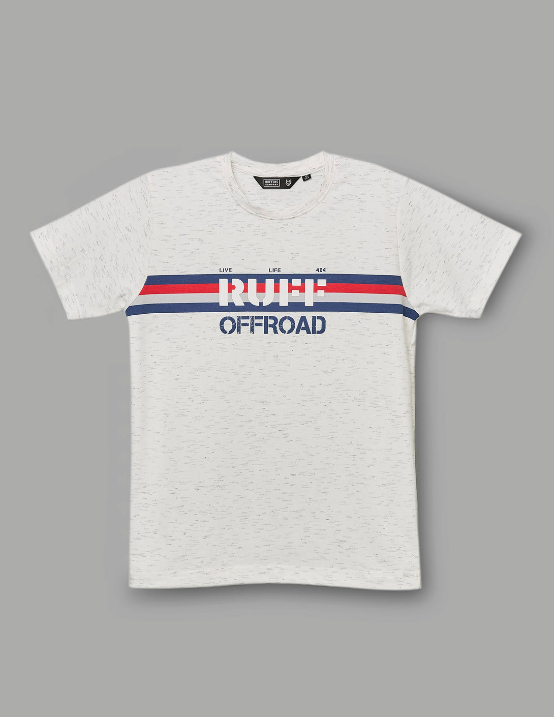 Adventure calls! This light grey speckled t-shirt features bold red and blue stripes with a "Ruff Offroad" graphic, perfect for active days. Comfortable and stylish for all their explorations.