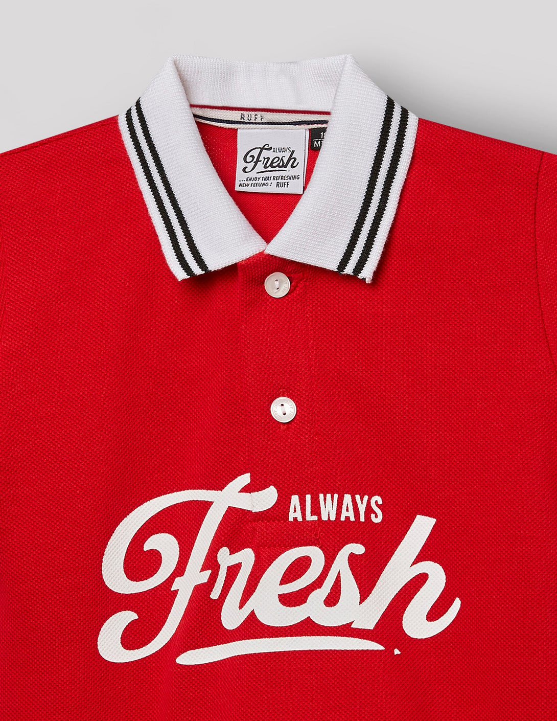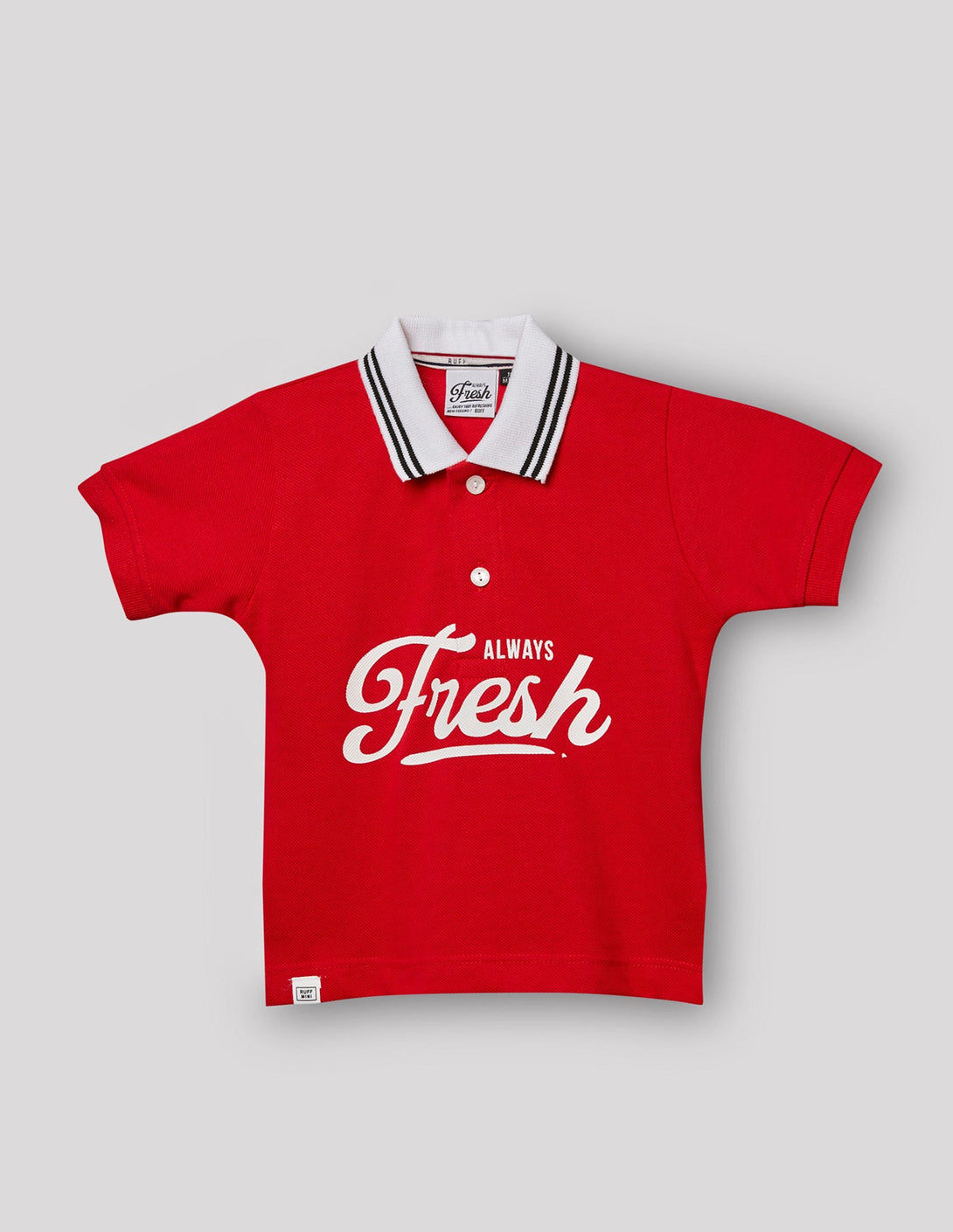 Stay cool and stylish in Mumbai's heat! This vibrant red polo shirt features a crisp white and navy striped collar and a bold "Always Fresh" graphic. Comfortable for everyday wear and adding a pop of color to their look.