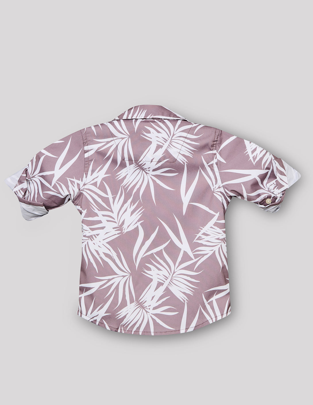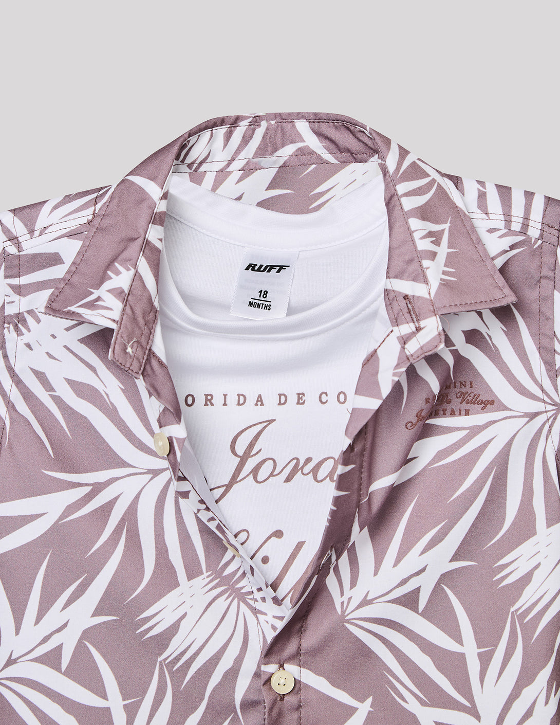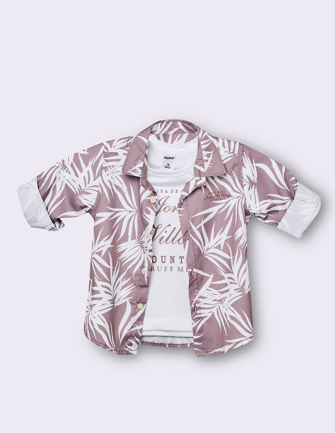 Two-piece tropical set features a light "onion" pink button-down shirt with a crisp white palm leaf print, layered over a soft graphic t-shirt for an instantly cool, coordinated outfit.