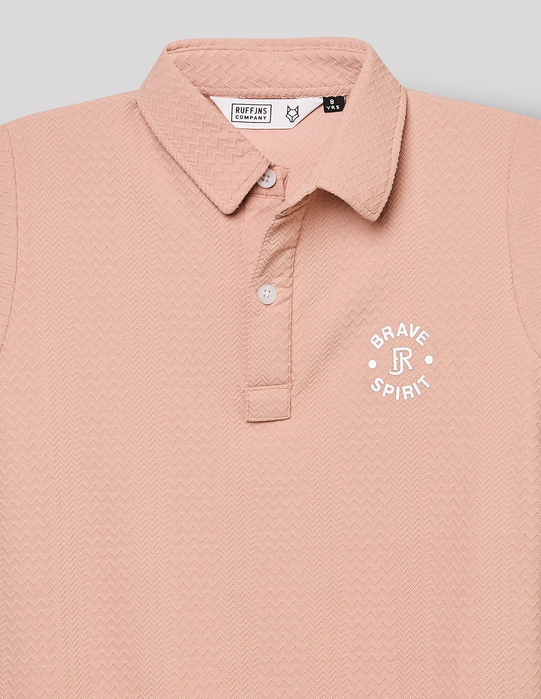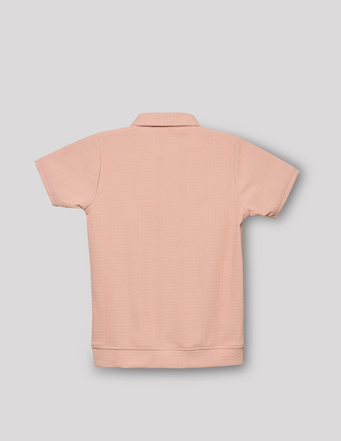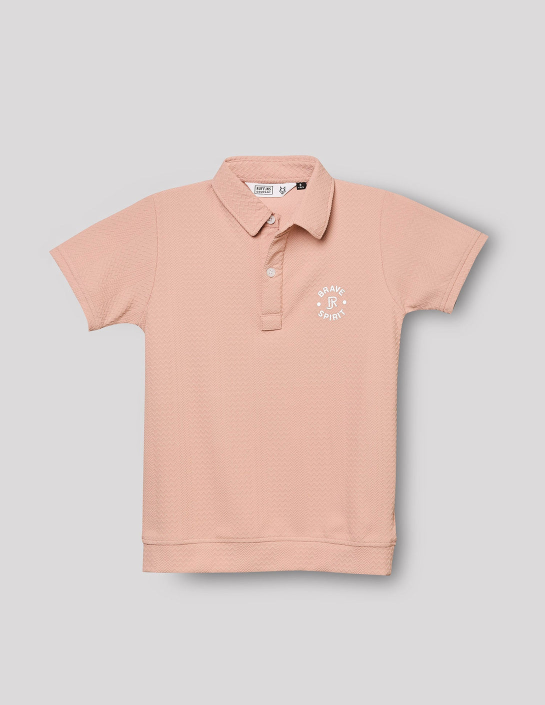 Soft and stylish! This peach-colored polo shirt features a subtle textured design and a small graphic. Comfortable and charming, it's a great choice for a neat yet casual look.