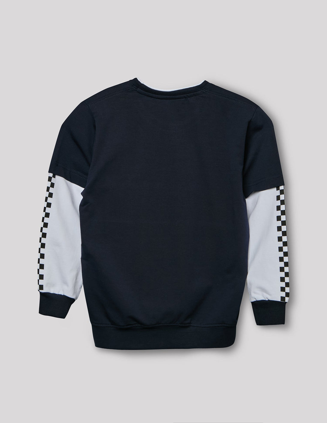 Navy blue full sleeves t-shirt for boys, featuring contrast white sleeves with sporty checkered detailing, bold chest prints, and a crew-neck design for a trendy casual look.