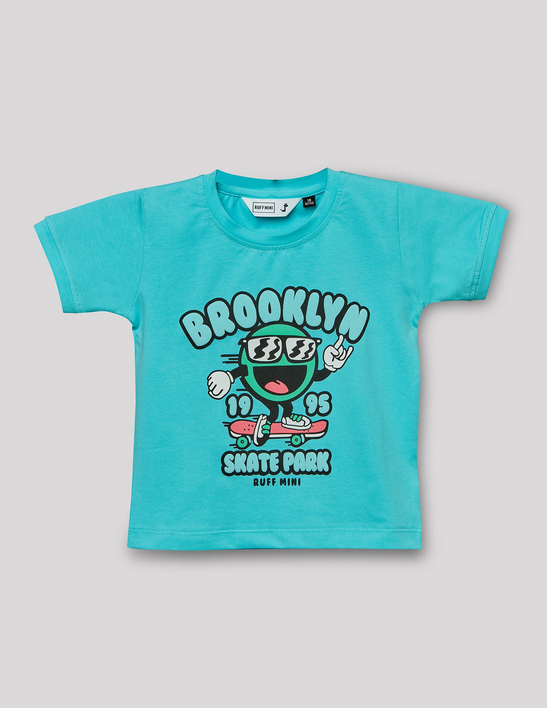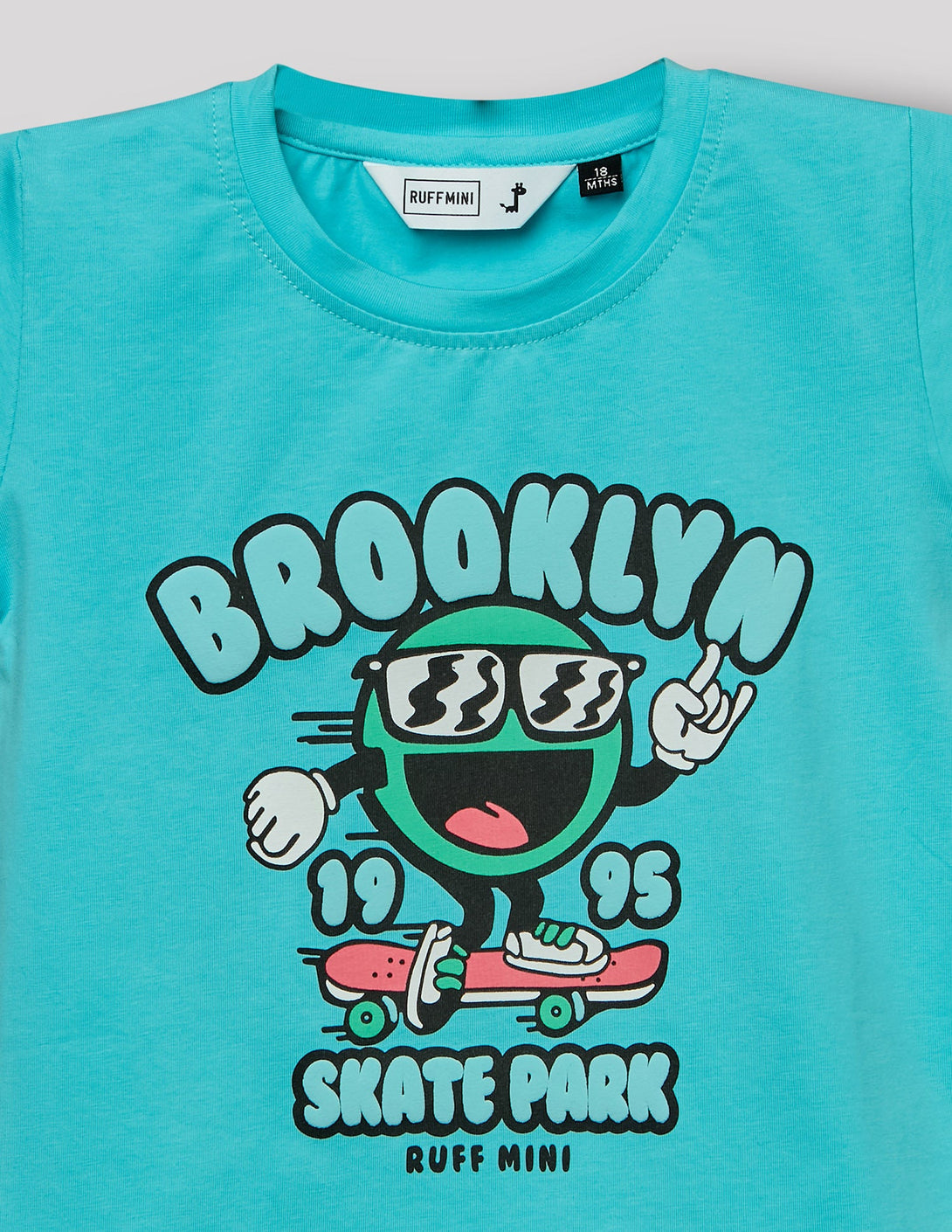 This bright turquoise t-shirt is perfect for little skaters and fun-seekers. It features a cool cartoon character riding a skateboard and a bold "BROOKLYN SKATE PARK" graphic for a fun, casual vibe.