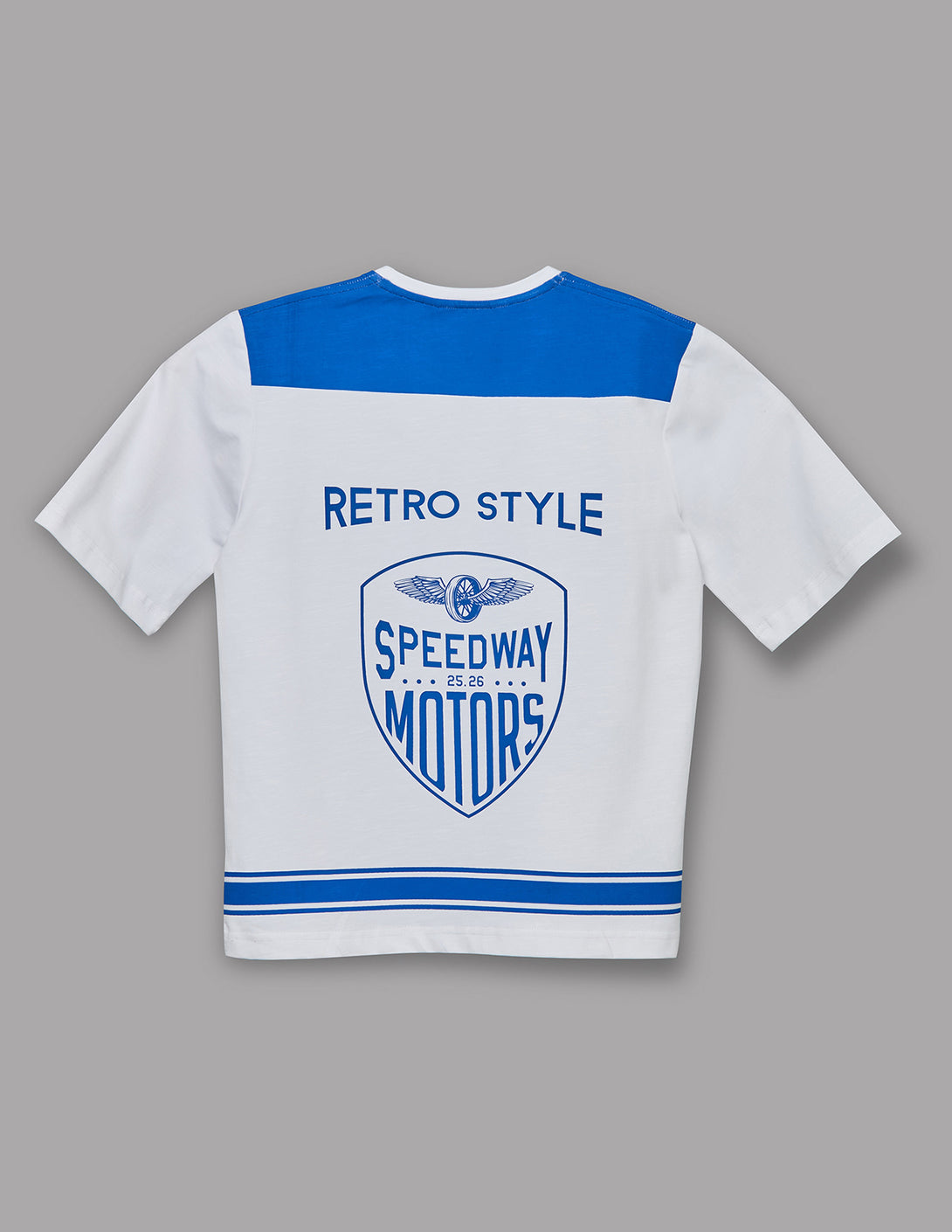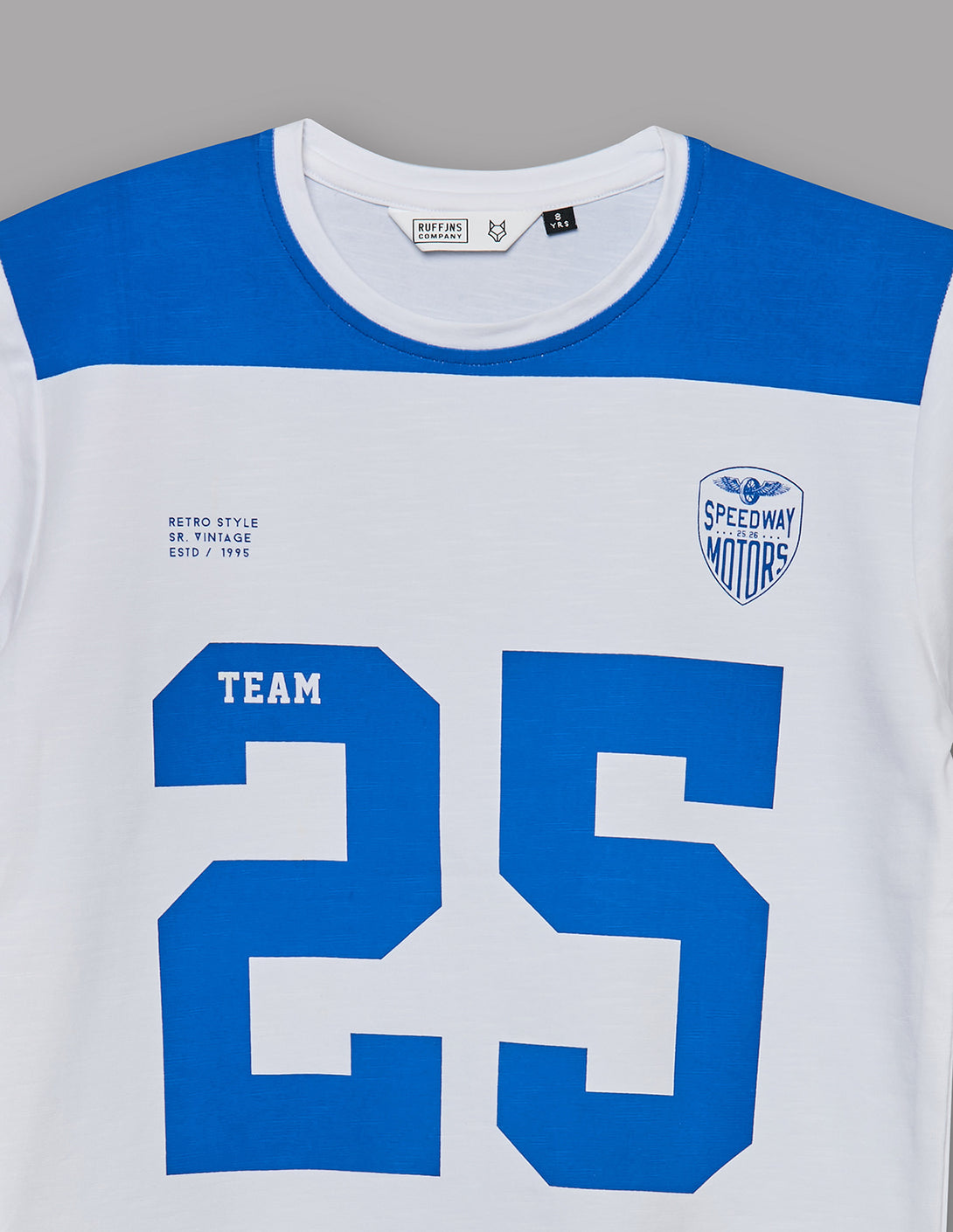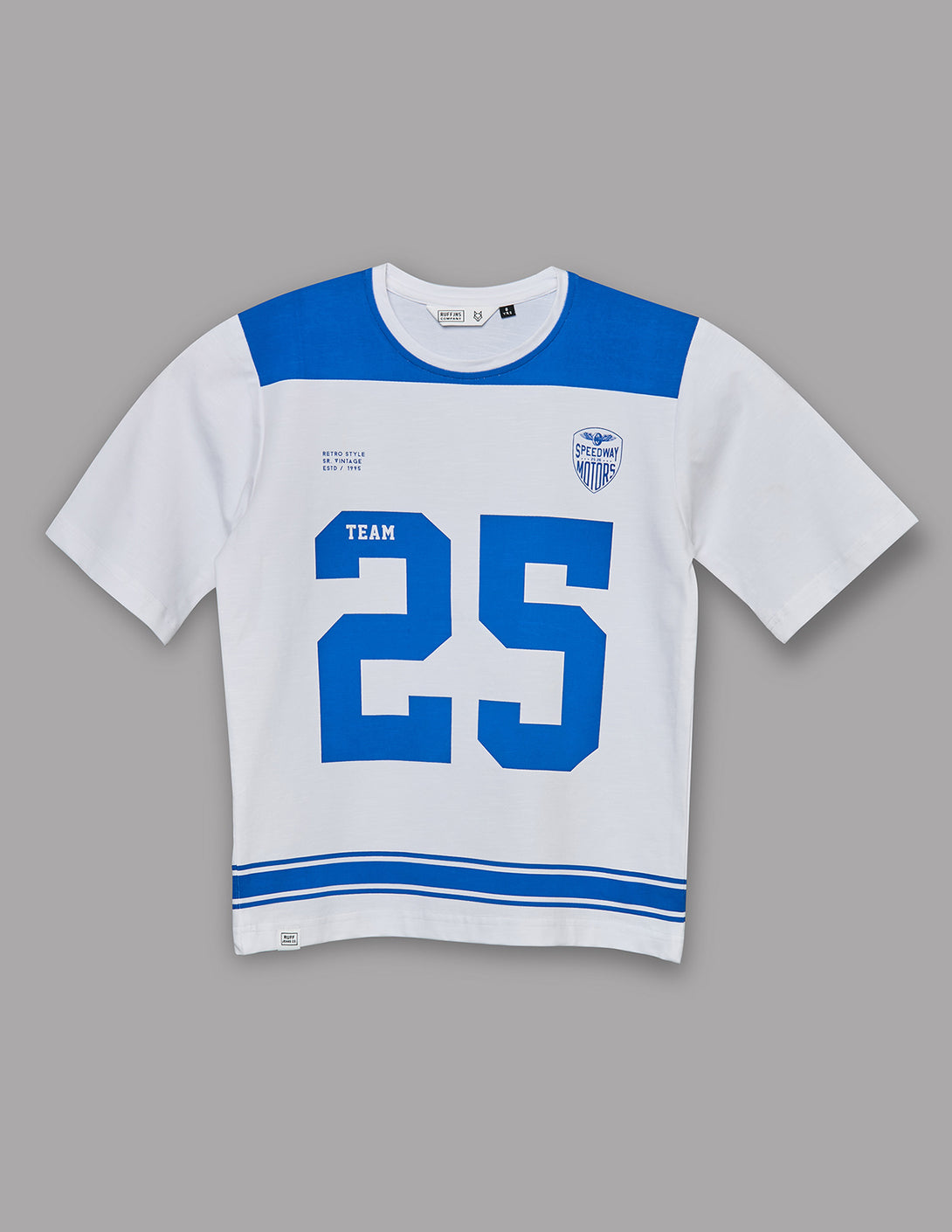 Score big on style! This sporty white t-shirt features bold blue accents, classic stripes, and a prominent graphic. Perfect for active kids who love a winning look.